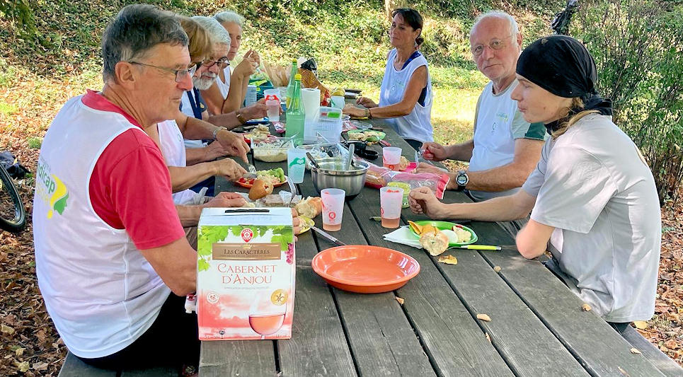 - Lundi 9 juin 2025 .J8.99km 649m + Le soleil est de retour et les jambes vont bien .Nous partons gaiement sur les routes de la Sarthe .Premier arrêt au Château du Lude .Au carrefour de l’Anjou, du Maine et de la Touraine, Le Lude figure parmi les grands Châteaux de la Loire.Tel qu’il se présente aujourd’hui avec ses quatre façades, chacune de style différent, le château du Lude est un vivant témoignage de l’évolution de l’architecture française depuis le Moyen Âge jusqu’au XIXème siècle. Il est l’un des derniers grands châteaux de la Loire encore habité par une famille, dont les générations se succèdent depuis plus de 250 ans. Entre le château et le cours du Loir, les jardins sont aménagés dès le XVIIème siècle. Nous poursuivons notre route en empruntant une voie verte (ancienne voie de chemin de fer ) jusqu'à la Flèche .Dans cette sous préfecture de la Sarthe ,implantée sur le Loir, au cœur du Maine angevin ,nous pouvons admirer Le Prytanée national militaire (cour d'Austerlitz) et le château des Carmes (Forteresse établie au milieu du XIe siècle, transformée par les religieux Carmes au XVIIe qui y établissent leur couvent, puis devient une habitation particulière après la Révolution. Plus ancien bâtiment de la commune, il est reconverti en mairie au début du XXe siècle) Après une pause café nous reprenons la route en passant à Bazouges Cré sur Loir puis la Chapelle d'Aligné où nous faisant la pause Picnic . L'après midi notre périple passe par Precigné ( procession intégriste ), Sablé sur Sarthe ( vue magnifique sur le château de Sablé, du XVIIIe siècle au bord de la Sarthe et l'église Notre-Dame, de style néogothique ) Notre périple se poursuit par des petites routes passant à Auvers le Hamon, Val du Maine , St Denis du Maine pour arriver dans la petite bourgade de Arquenay où nous avons réservé le gîte le Hibou , rue de l'étang en pleine nature . 99km 649m + |