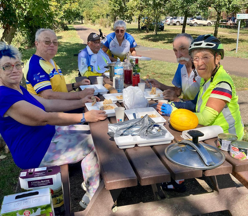 Mardi 3 juin 2025.J2.106km 1195m + Ce matin nous sommes 3 à pédaler : Patrick , Corinne et moi en tandem .Nelly conduit le véhicule .Notre duo avec Corinne est parfait .Nous démarrons du gîte sous l'oeil bienveillant des huskis de la propriétaire. Notre périple est le suivant : St Sauveur la Sagne, Novacelles, St Bonnet le Chastel, Chambon sur Dolore, Fournols, St Eloy la glacière, St Dier d'Auvergne . Là nous retrouvons Nelly pour le picnic . Nous sommes rejoint par Jean Luc de St André le Coq.Nous repartons ensemble pour aller à Trézioux, Sermentizon, Château de Ravel (Ancienne forteresse royale du XIIe siècle, réaménagé sans destruction au XVIIIe siècle, au jardin dessiné par André Le Nôtre, il a été l'hôte du tournage du film Les Choristes, à l'été 2003 ) , Lezoux , Lempty, Joze, Maringues. Arrivée à St André le Coq après 106km 1195m + Acceuil par le maire du village.Goûter chez Nicole et Jean Luc . Nelly va récupérer notre chauffeur Beradjaa à la gare d'Aigueperse. Notre hébergement chez Magalie est situé à Pagnant ,commune de St André le Coq..En soirée ,temps orageux avec pluie +++ |