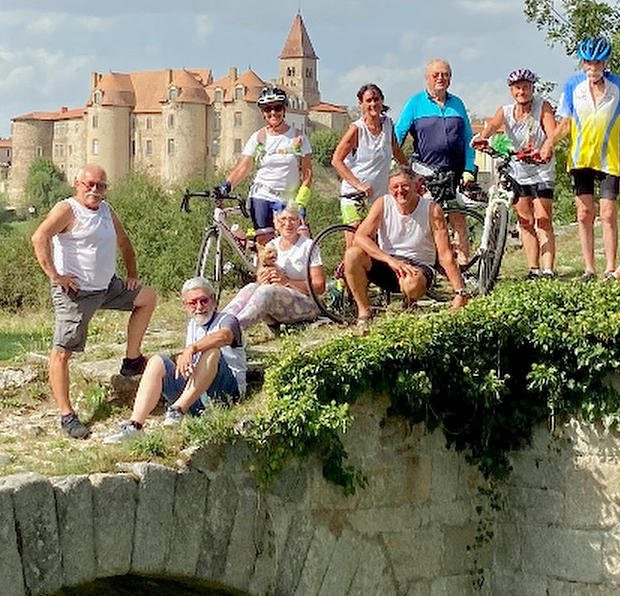 Mecredi 4 juin j3 Ce jour temps couvert , nous sommes 4 à pédaler : Monique et Nelly en tandem , Corinne en vélo solo et Jean Luc en VAE .Peu après St André le coq nous sommes rejoints par 3 sympathiques cyclos du Cyclo- Club de Gannat : André le Grand , Alain , Gérard dit Gégé le petit . Ainsi Martine de Clermont Ferrand, accompagnée d'un collègue .Toute cette troupe nous accompagne jusqu'au Château d'Effiat , château édifié au XVIIe siècle par le Maréchal d'Effiat, troisième personnage du royaume, père de Cinq Mars. On peut admirer le portail monumental en pierre de Volvic, décoré des armoiries du Maréchal d'Effiat.Nous ne visitons pas l'intérieur. Par contre on s'amuse du spectacle des animaux du cirque à proximité \uD83D\uDE05 Là Martine et son pote nous abandonne . Nous repartons en compagnie des cyclos de Gannat jusqu'à l' église : Sainte-Croix de Gannat, au centre de la ville, qui possédait un évangéliaire (manuscrit enluminé du dernier quart du IXe siècle ) Chaque été, au mois de juillet, se déroule à Gannat le festival Les Cultures du monde. Comme il pleut à verse nous allons prendre un café à proximité. Nous profitons d'une accalmie pour repartir en allant au viaduc de Rouzat , un ouvrage d'art construit en 1869 par Eiffel sur la ligne de chemin de fer Commentry - Gannat permettant de traverser la Sioule entre les communes de Bègues et de Saint-Bonnet-de-Rochefort, dans l'Allier. Il est inscrit comme Monument historique. Notre périple nous conduit ensuite à St Bonnet de Rochefort où nous picniquons en compagnie de Martine, présidente du cyclo club de St Pourcain sur Sioule et de Marie Hélène . Elles nous offrent gentiment le café. L'après midi nous repartons toutes les 3 en passant au château de la Mothe , domaine du XIIe, remanié au XVe et au XVIIIe siècle situé à Vicq. Puis nous grimpons à l'église Sainte-Croix ,église romane située à Veauce dans l'Allier. Nous poursuivons sur la D118 où nous retrouvons Martine et Marie- Hélène qui nous accompagnent jusqu'à Montmarault.Nous passons ainsi à Coutansouze , Viaduc du Bellon (viaduc ferroviaire situé à Coutansouze et Louroux-de-Bouble, dans l'Allier. Il porte la ligne de Commentry à Gannat et est inscrit aux Monuments historiques), Vernusse , Blomard . A Montmarault, les copines repartent et nous poursuivons toutes les 3 notre périple en allant à Chappes , Murat et sa magnifique église St Nicolas , (édifice de base romane (XIe et XIIe siècles) bâti en pierres de la région, de couleur rougeoyante et dotée d'une caquetière ) Villefranche d'Allier, Neuville (château (XIXe siècle abritant un IME et chapelle à proximité dotée d'un clocher à base hexagonale surmonté d'une flèche ) . Nous arrivons à notre hébergement , chambre d'hôtes l'Orchidée, situé à le Sac , Hérisson juste avant l'averse du soir . Belle journée de pédalage. |